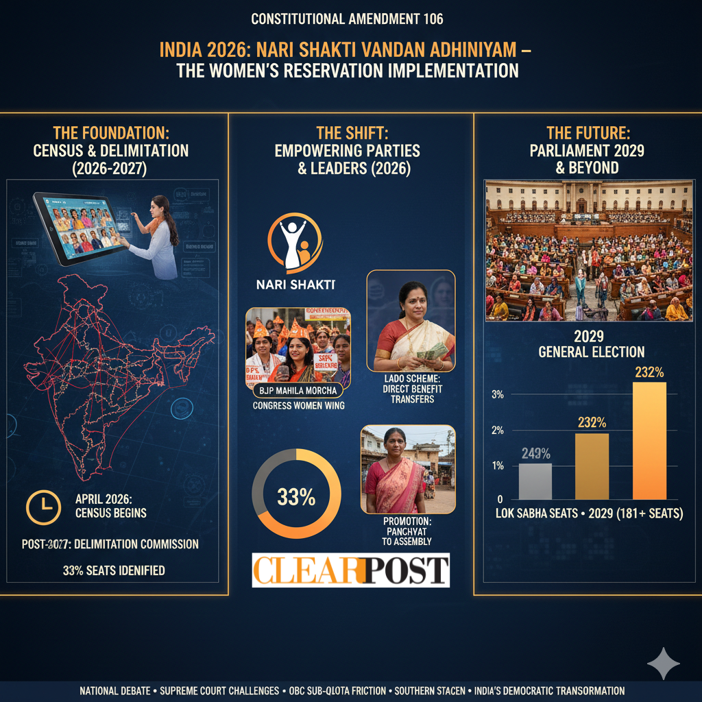 As of January 2026, the Nari Shakti Vandan Adhiniyam (106th Constitutional Amendment) has entered its most critical phase. While the law was passed in 2023, its practical implementation is legally tied to the 2026 Delimitation Exercise, which has now officially begun.